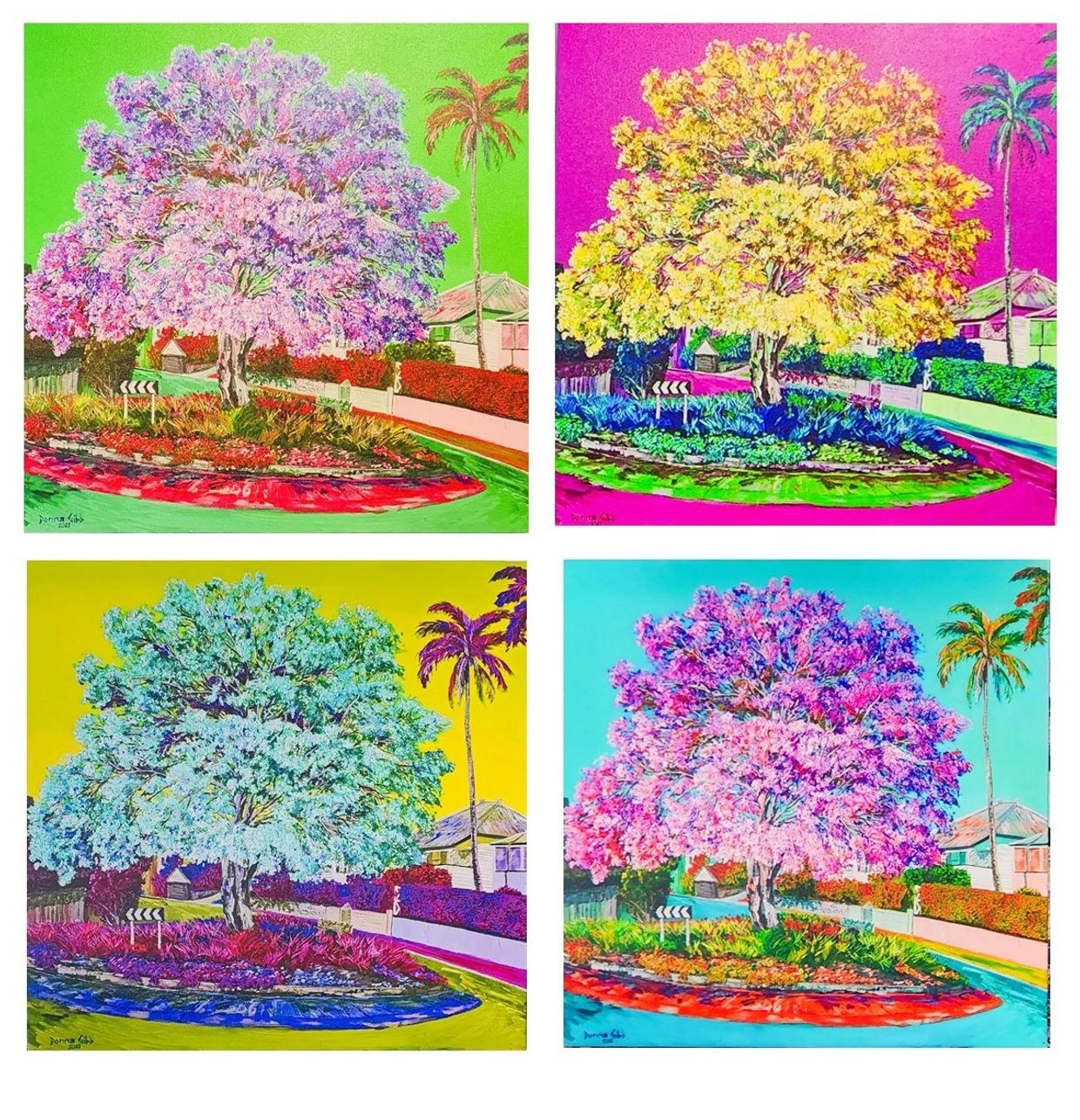"Pink Tree on Days Road" comes with Pink, Aqua, Green or Yellow background. 50cm x 50cm stretched canvas print. $350 each or 4 for $1200.00